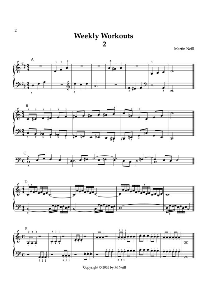 These workouts have been inspired by common problems I’ve noticed among my adult students, as they move from Clementi into music with bigger textures, multiples voicings, and more advanced phrasing, and where more dexterity is required. However, they could be useful for more advanced young pupils.