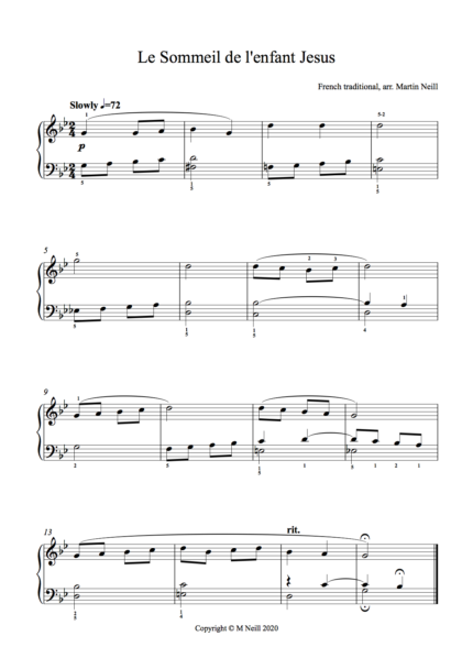 This is a beautiful French lullaby. Watch out for the G minor key signature, and the tied notes in the left hand.